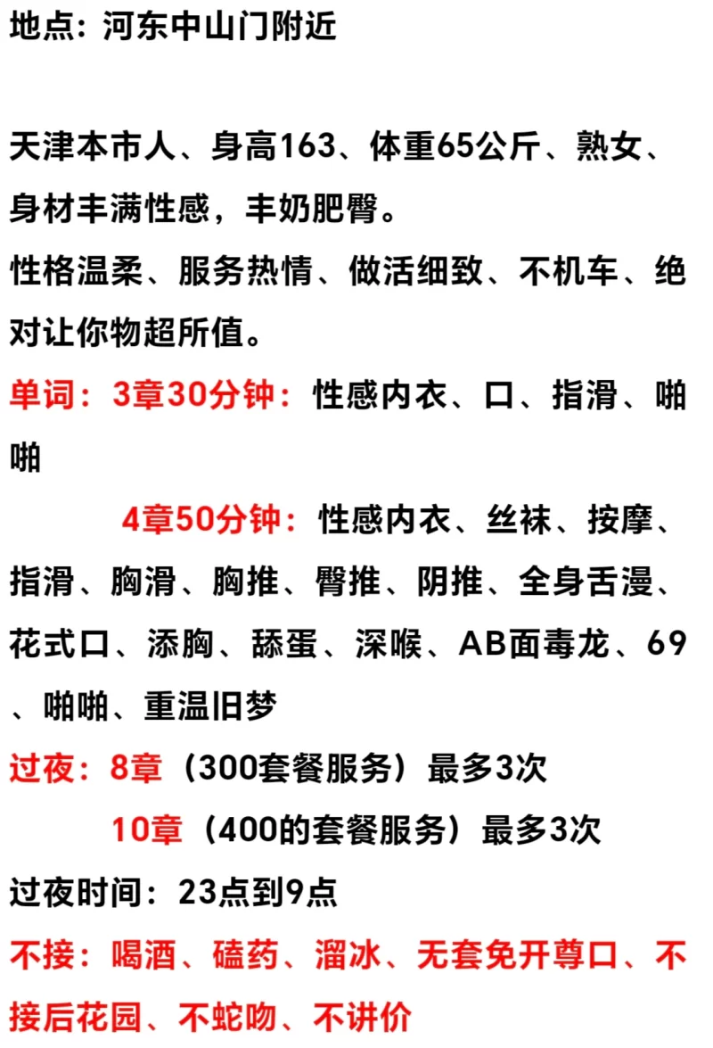 服务项目:性感内衣、丝袜、按摩、指滑、胸滑、胸推、臀推、阴推、全身舌漫、花式口、添胸、舔蛋、深喉、AB面毒龙、69、啪啪、重温旧梦